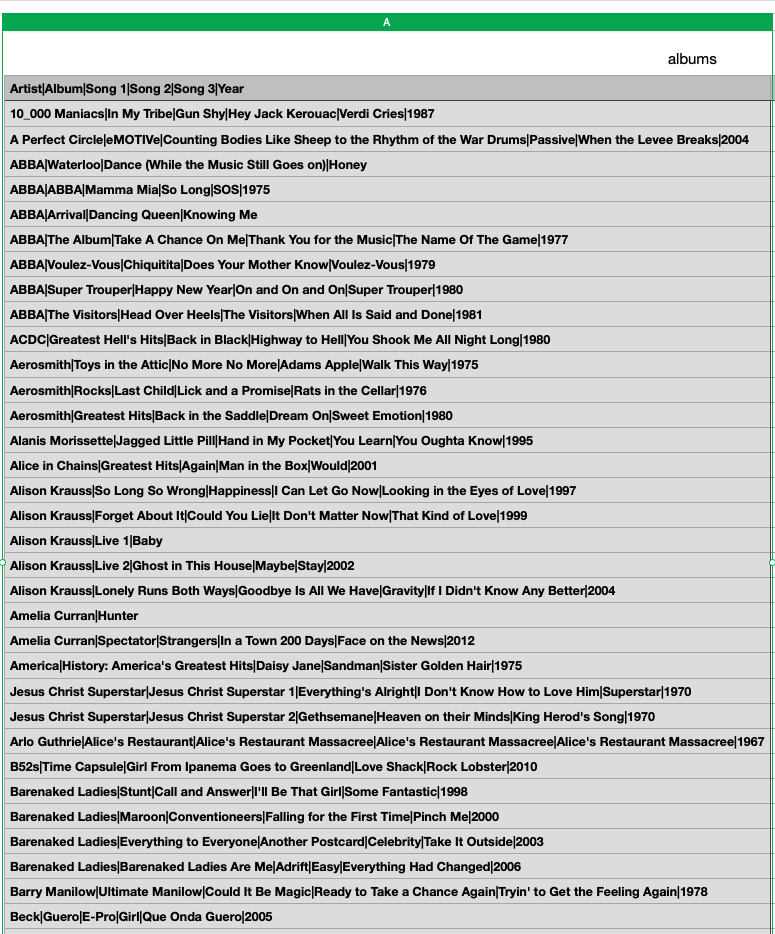 Hugh’s Album List includes his favorite songs, organized by artist and album.